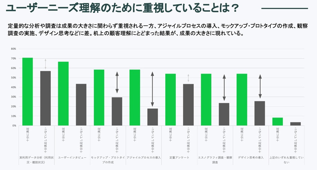 So, what should be done to understand user needs? Looking at responses to "What do you prioritize to understand user needs?", "Analysis of actual usage data" and "Quantitative surveys" are commonly implemented by both successful and unsuccessful companies. However, "Creating mockups/prototypes", "Implementing agile processes (a development method involving repeated implementation and testing in short cycles)", ethnographic research (a method where researchers live with subjects for a period to observe behavior), and observational studies are practiced at a higher rate by successful companies. This result suggests that key processes go beyond data analysis alone—they include presenting actual products to gather user opinions and making improvements based on concrete feedback.