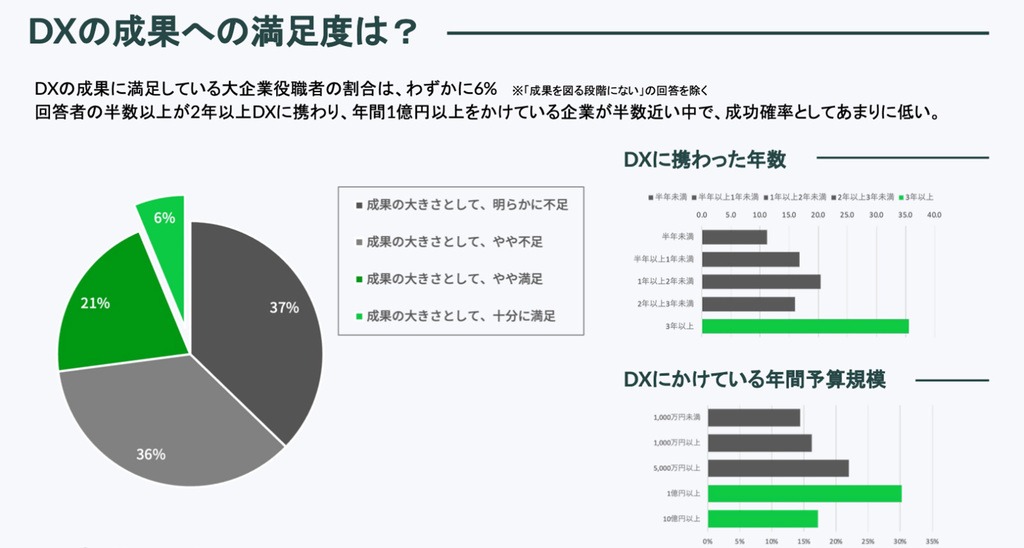 Kuribayashi: First, the satisfaction level with DX outcomes. Only 6% responded that they were "fully satisfied." Considering that over half of the respondents have been engaged in DX for more than two years and are investing annual budgets exceeding 100 million yen, this indicates a very low success rate.