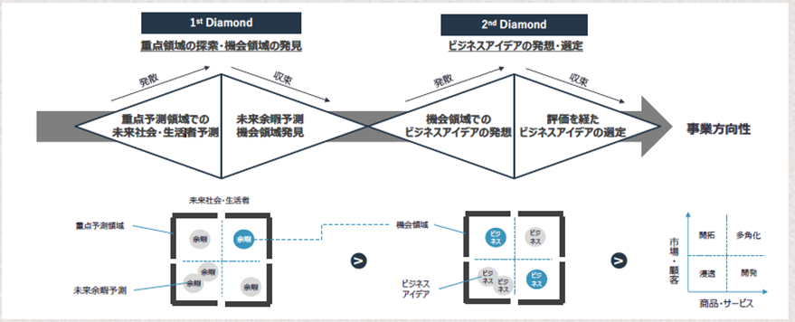 Kagata: Yes, that's correct. There's a business ideation framework using design thinking called the "Double Diamond" method. This involves drawing two diamonds to represent the process of "divergent" and "convergent" thinking, helping to find a path to solving problems. Applying this to launching a new business: the first diamond defines the problem to solve and the domain to tackle. The second diamond involves brainstorming ideas within that domain, generating as many possibilities as possible – the "divergence" phase. Then, considering feasibility and other factors, you narrow down the options – the "convergence" phase.