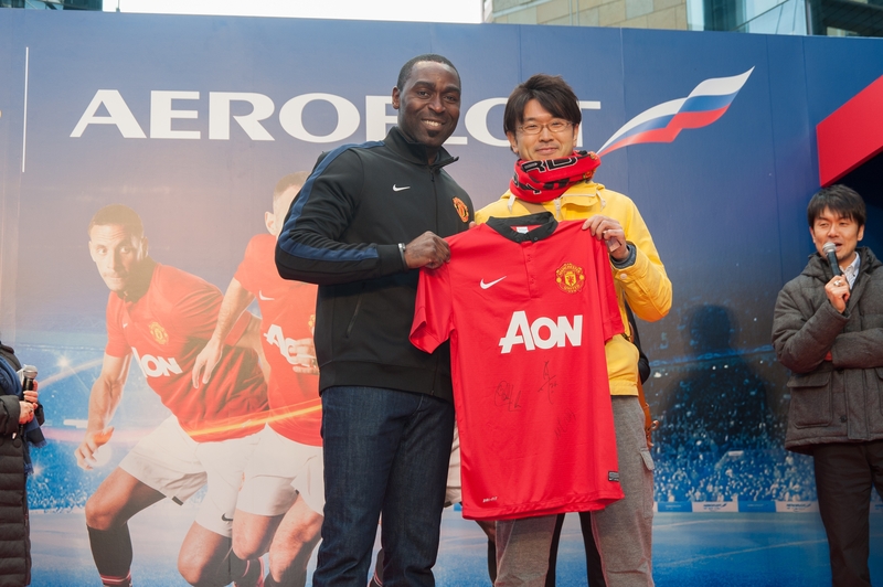 The event also featured a video message from club player Shinji Kagawa and dazzling performances by freestyle footballers. A quiz contest and raffle were held, with prizes including the company's original merchandise, the club's official ball, and player-signed T-shirts. Official website ( manutd.aeroflot.com/jp/ )