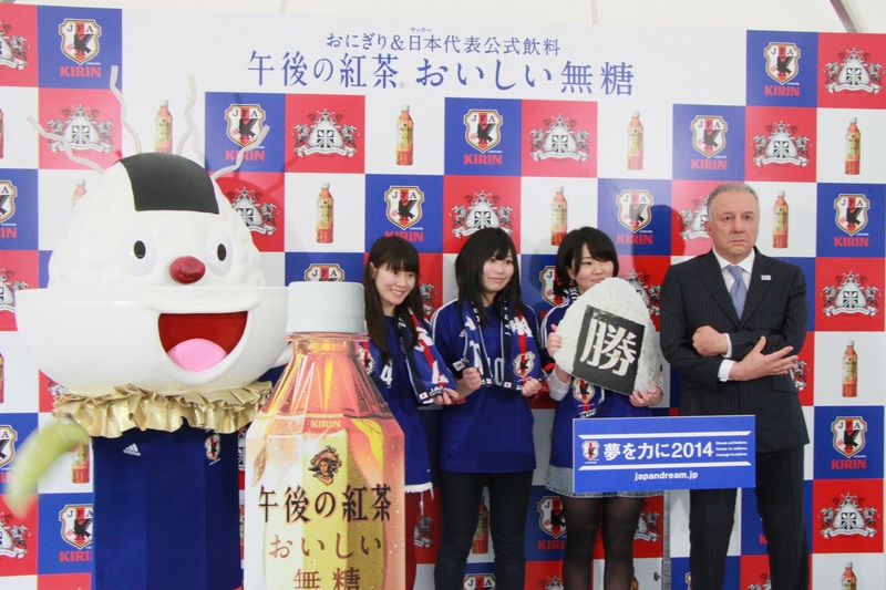 On March 3rd, just before the Challenge Cup began, the presentation ceremony for the "Kirin Afternoon Tea Delicious Unsweetened 'Victory Rice Ball Project'" was held at the National Nishigaoka Soccer Stadium in Kita Ward, Tokyo. This followed the decision to make Delicious Unsweetened the official beverage for rice balls and the Japan National Football Team. Coach Alberto Zaccheroni and player Shinji Kagawa, who were training at the venue, attended. Toshiya Maruoka, General Manager of Kirin Beverage Marketing Headquarters, and "Gogo-no Ko-chan," the official character for the rice ball project, presented the beverage and the "Victory Rice Balls." The Victory Rice Ball Project involves engraving support messages for the national team, collected from the public, onto the nori seaweed wrapping the rice balls using a laser cutter, and delivering them to the team. Over 6,200 messages were submitted.