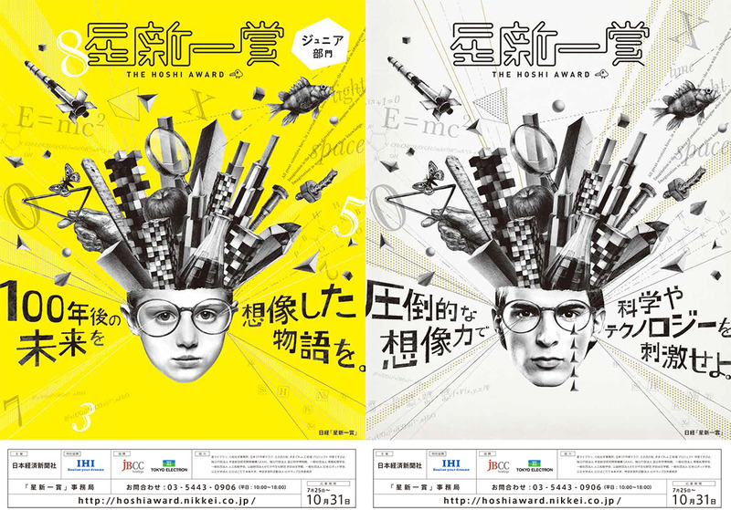 The 1st Nikkei "Hoshi Shinichi Award" General Division awarded the Grand Prize to Shinichi Endo (52) for "From the 'Valley of Fear' to the 'Peak of Ecstasy' ~ Its Policy Applications," one Runner-up Prize, two Excellence Awards, and the Junior Division Grand Prize to Chihiro Matsuda (15) for "Grandma." The photo shows the poster for the 1st call for entries.