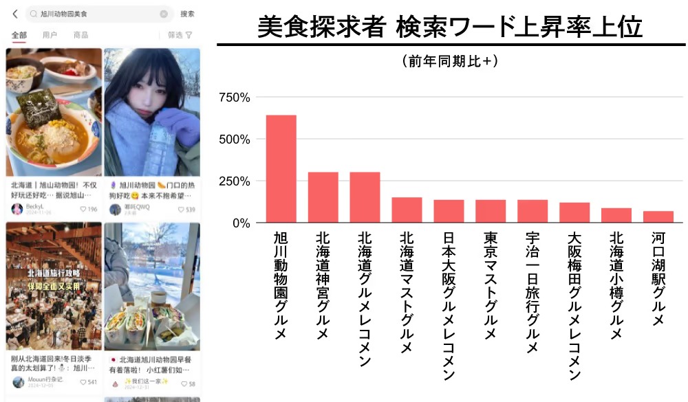 Additionally, likely influenced by the winter survey period, many trending keywords were related to Hokkaido. Interestingly, it's not the Clock Tower, typically thought of as a tourist landmark, but the Japanese-style "Hokkaido Jingu Shrine" that appears as a gourmet keyword. Furthermore, Otaru was the only Hokkaido location to rank in the TOP 10. This result suggests a broadening of destinations beyond major staples like Sapporo and Furano.