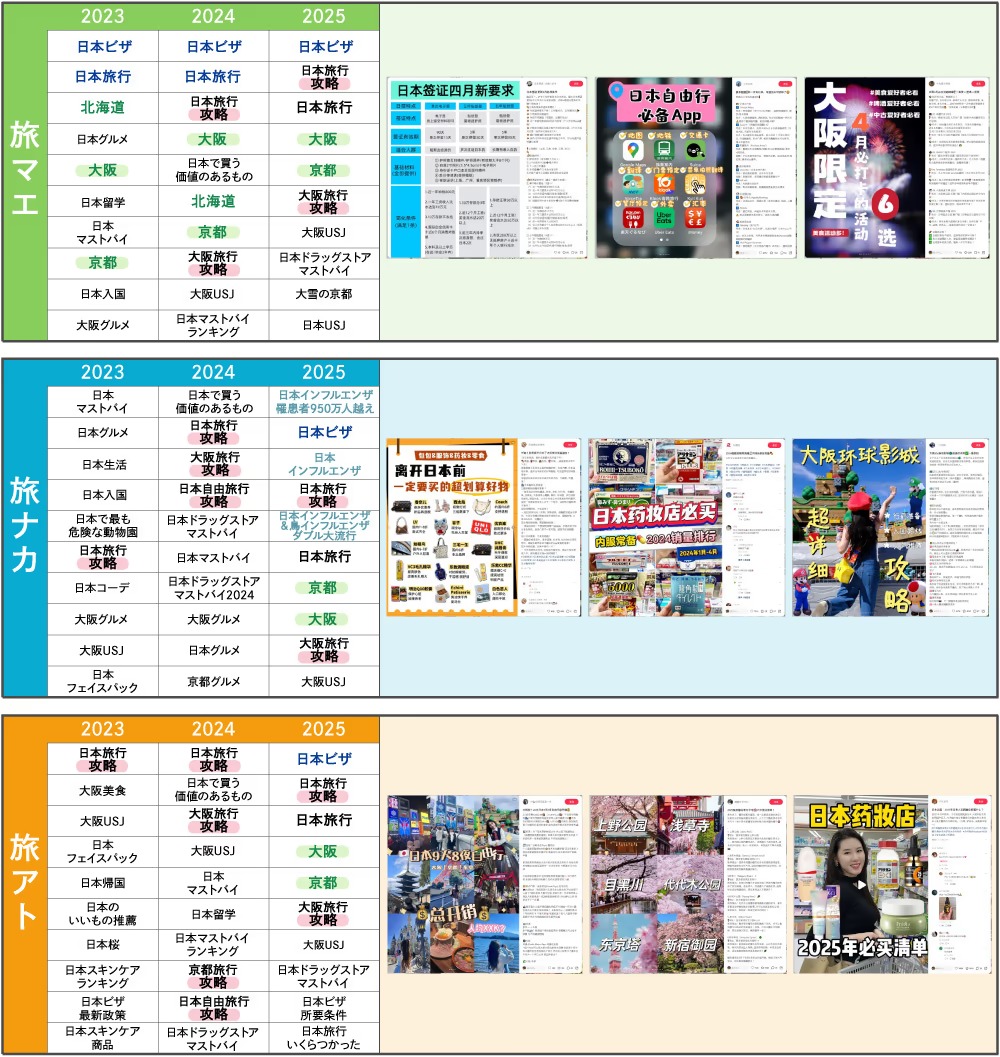During the "pre-trip" phase when travel preparations begin, visa procedures—essential for Chinese visitors entering Japan—remain consistently at the top. Additionally, broad information searches are conducted for place names like "Japan travel," "Osaka," and "Kyoto," or by adding "攻略" (a Japanese-derived word meaning 'tips' or 'guide' in Chinese travel contexts).While many Chinese travelers are repeat visitors, and it's said "it's no longer just Tokyo, Osaka, and Kyoto," these classic spots remain overwhelmingly popular overall.