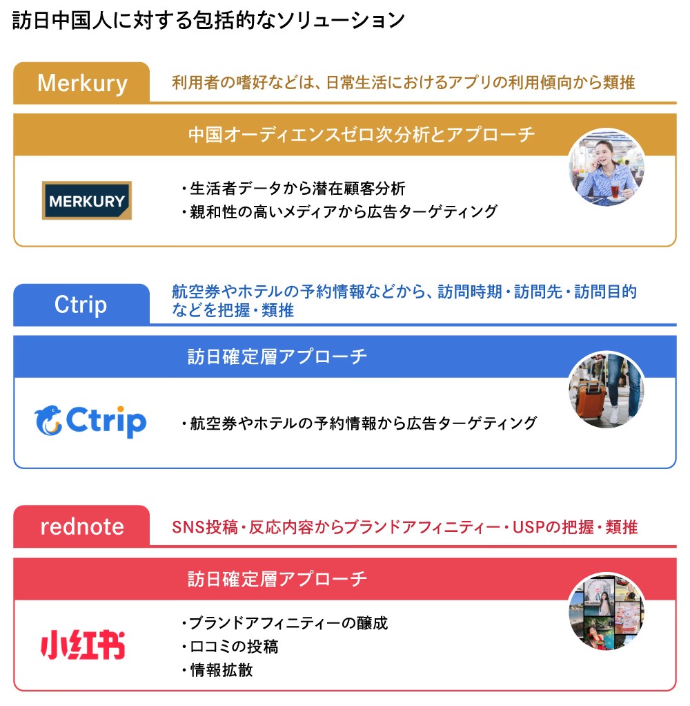Dentsu Inc. provides a solution that comprehensively addresses marketing for visitors' "pre-trip, during-trip, and post-trip" phases.In addition to rednote, featured here, Dentsu Inc. supports clients aiming to maximize capture of inbound spending through partnerships with various tools and platforms. These include Ctrip, the largest online travel agency (OTA), and "Mercury," an audience platform leveraging Dentsu Inc. China's device information from 1.2 billion IDs. This enables effective, efficient, and pinpoint advertising targeting based on attributes and behavior.