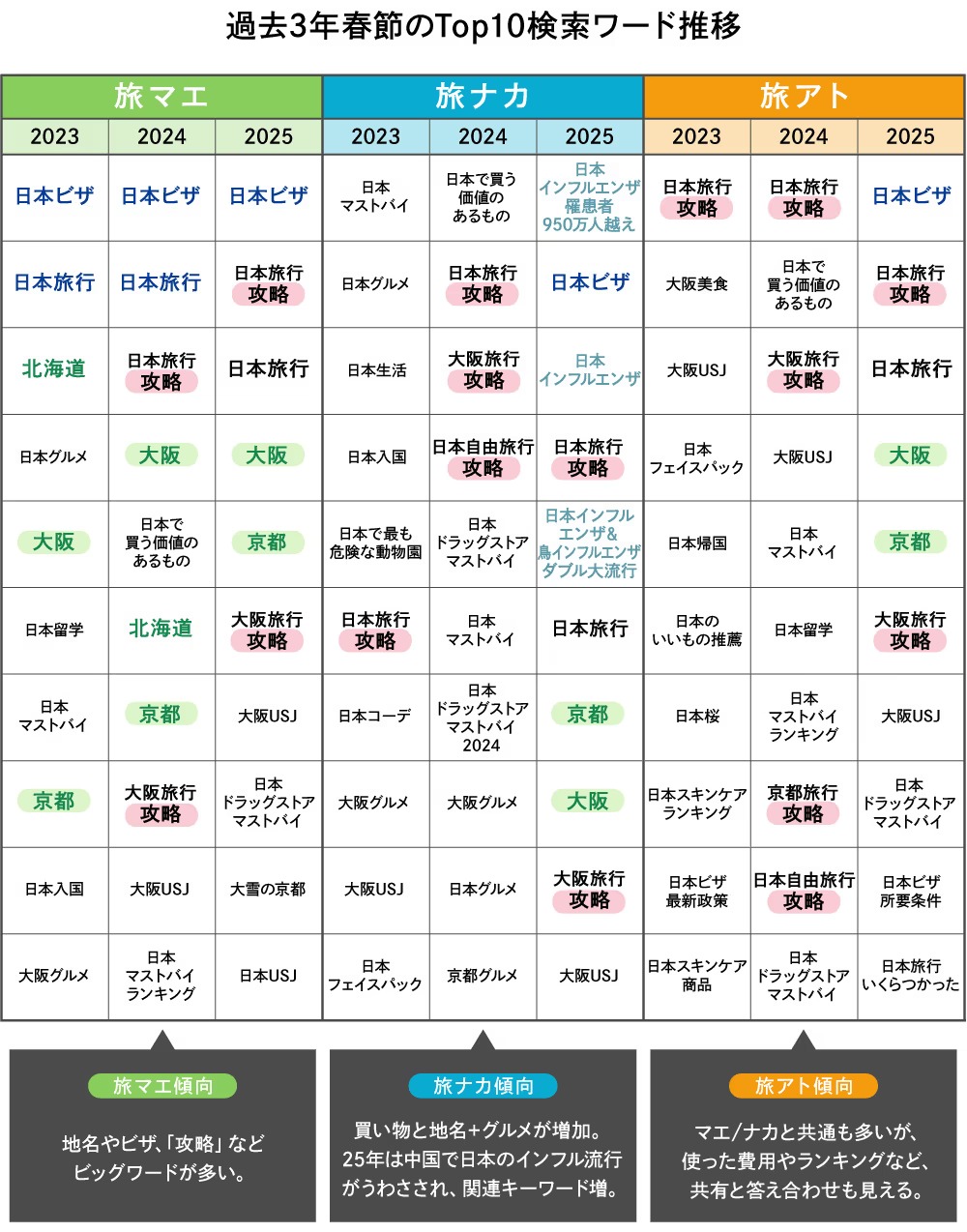 So, what exactly are they doing in Japan? What does this diversification and complexity specifically entail? To explore the overall changes occurring recently, let's examine the trends in the Top 10 search keywords during the Spring Festival period over the last three years, broken down into "Before Travel," "During Travel," and "After Travel."