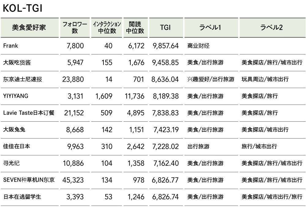 Food explorers are referencing not only major KOLs (influencers) with around 10 million followers and broad-reaching influence, but also many KOCs (Key Opinion Consumers) who, while having several thousand followers, possess high TGI(※).When a clear appeal theme is established, collaborating with KOCs—who may have smaller follower counts but wield significant influence within specific niches—for information dissemination is well worth considering for both effectiveness and efficiency.