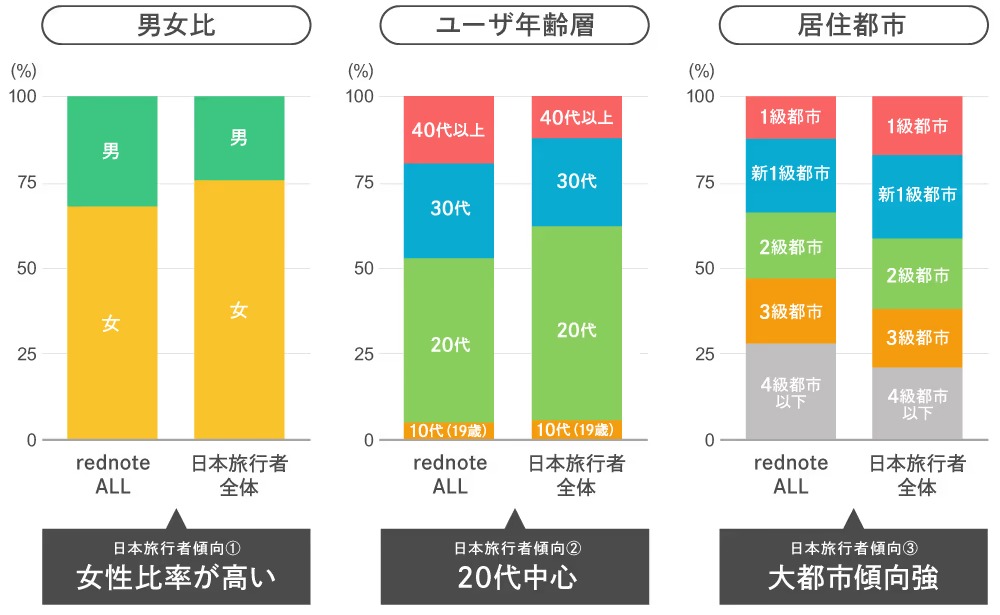 First, let's examine the differences between the overall rednote user base and the segment of users who traveled to Japan. Demographically, rednote is a platform with a high proportion of female users. Within the Japan traveler segment, the female ratio is even higher (considering that among all Chinese visitors to Japan, the ratio is 44.6% male and 55.4% female (※1), the female ratio here is remarkably high).Even within the generally young rednote user base, Japan travelers are younger, with those in their 20s making up the majority. They also tend to come from first-tier cities like Beijing and Shanghai (※2), followed by emerging first-tier cities such as Chengdu (Sichuan Province), Hangzhou (Zhejiang Province), and Wuhan (Hubei Province).