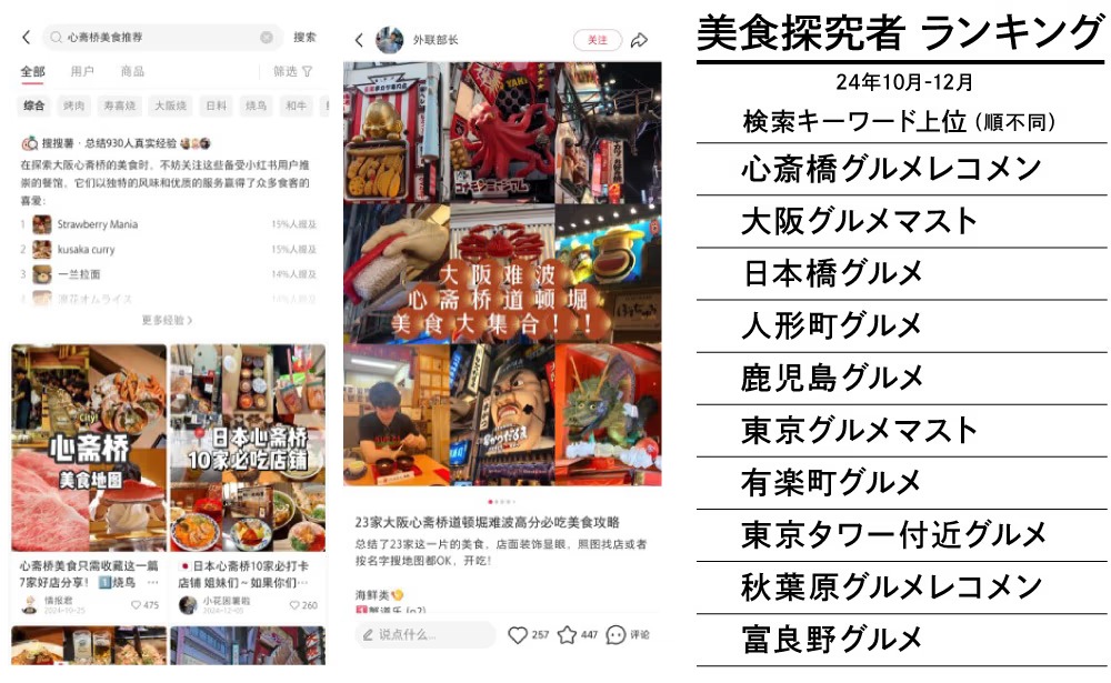 Here, we'll introduce the "Food Seekers," a segment with relatively clear characteristics. Tokyo, Kyoto, and Osaka form the so-called Golden Route of Honshu, traditionally the most popular cities among inbound tourists. Among these, Osaka-related place names dominate the top search terms, clearly attracting attention from young Chinese travelers. Specific locations like "Shinsaibashi," "Nipponbashi," "Nagahoribashi," "Daikokucho," and "Rinku Town" are frequently searched alongside these names.Conversely, names of dishes commonly considered Osaka specialties and immediately recognizable to Japanese people, like "okonomiyaki" or "takoyaki," do not appear. While takoyaki is a relatively common sight in China and carries an image of being "Japanese," it seems that among Chinese visitors to Japan, the place name "Osaka" is not as strongly associated with it as it is for Japanese people.