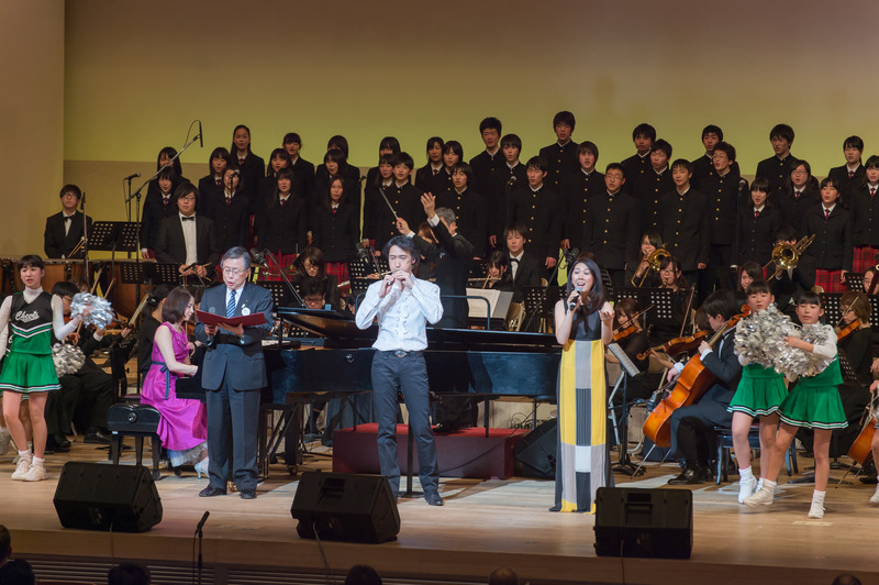 Next, at the "Fukushima Concert: Echoes of Recovery" (hosted by Fukushima Prefecture), local performers including members of the Fukushima University Orchestra, the Aizu High School Choir, and the cheerleading group "Claps," joined by guest artists: gagaku musician Hideki Togi, pianist Yukie Nishimura, and singer Hanako Oshima, played music filled with hope for the future. Finally, Governor Sato, all performers, and approximately 1,000 attendees united in a choral and ensemble performance. They paid tribute to the victims and renewed their commitment to reconstruction.