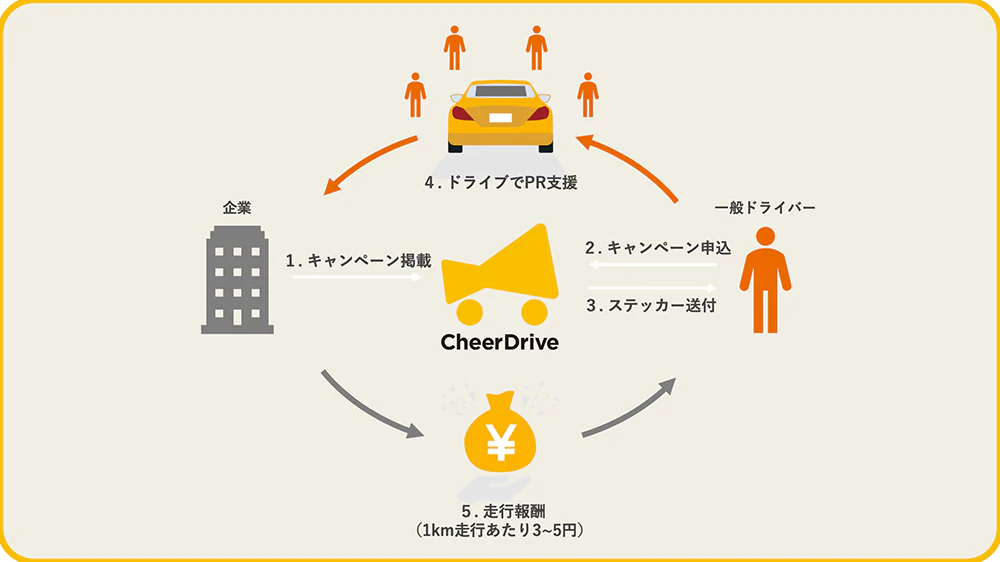 Drivers—ordinary people themselves—take action to "spread" the word about the products and companies they support. As a thank-you, they receive advertising fees. This form represents the origin of the CheerDrive service I envisioned, and I feel we've finally begun to realize the business model I initially imagined.