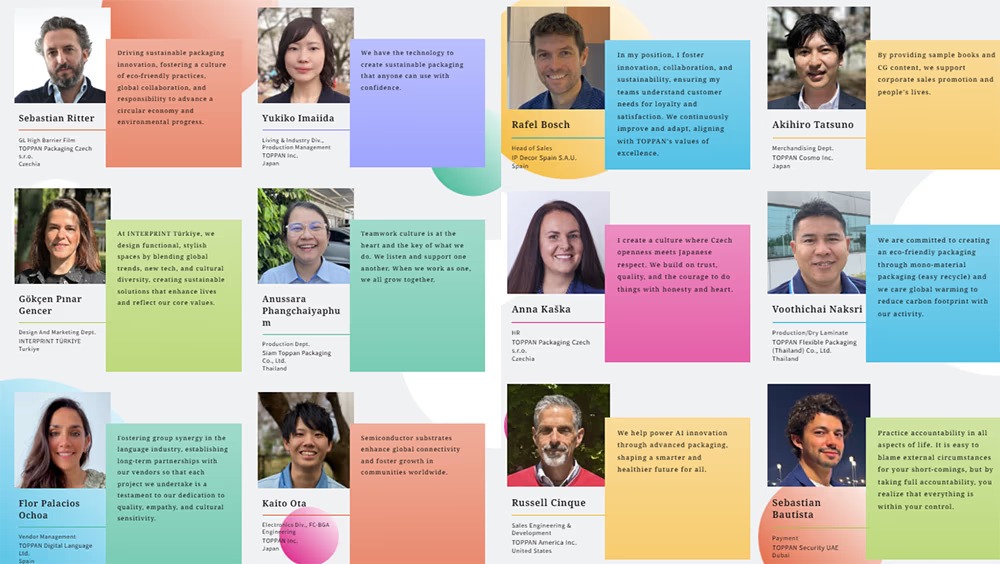 Watanabe: The completed interview videos were a major undertaking—10 people × 3 languages (Japanese, English, Chinese) totaling about 30 videos. But I feel we successfully visualized what makes TOPPAN unique. Beyond the content, the 125 messages themselves—even just the photos—had real impact, resulting in a truly unique final product.