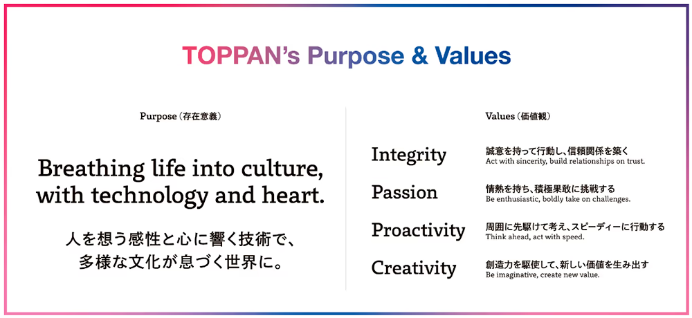 Throughout its long history, TOPPAN has been deeply rooted in the strong image of being a "printing company." While that solid foundation is a strength, it could also sometimes be perceived as conservative or reactive. That's precisely why, now, every single employee is moving proactively, driven by passion, aiming for "a world where diverse cultures thrive." We want to build a Culture we can be proud of, while communicating this very image.