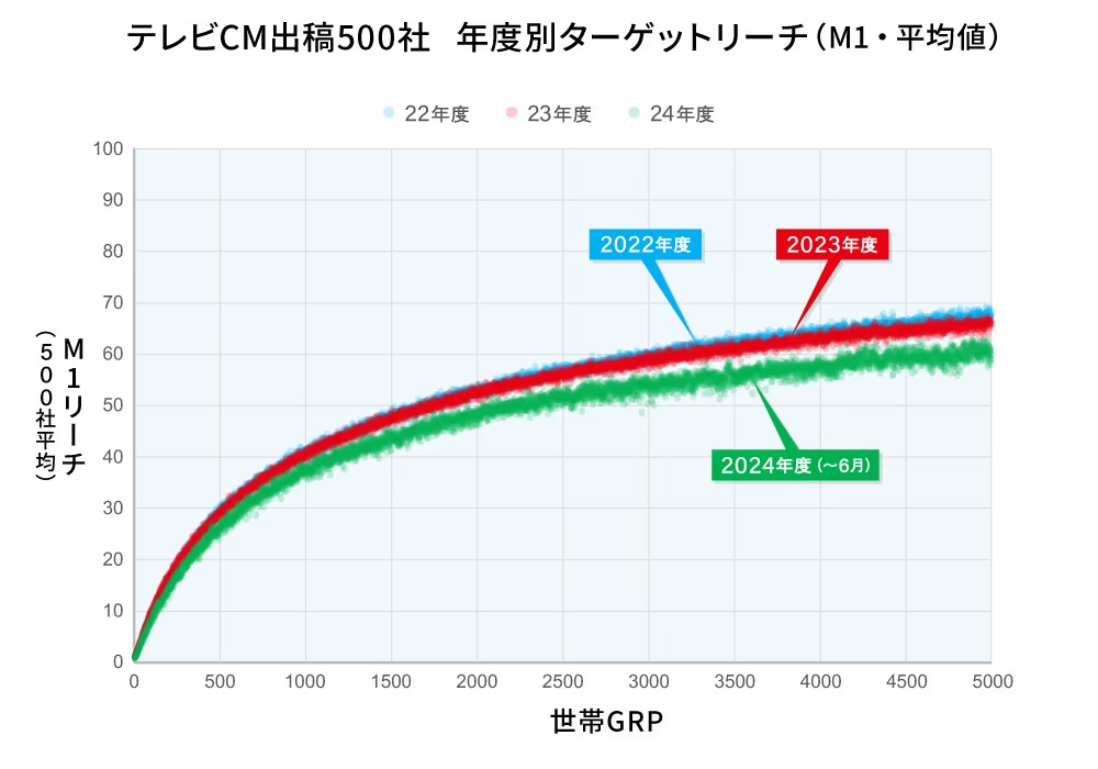 Kuboya: Even in terms of reach for TV commercials, I believe TV maintains its strength. The graph below shows the reach among the M1 demographic (men aged 20-34) for the top 500 companies by TV ad spend over approximately two years.