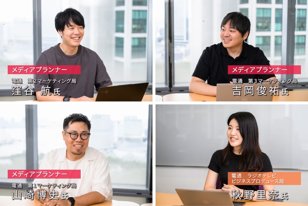 For the first installment, three media planners from Dentsu Inc. who work directly with advertisers on the front lines—Wataru Kuboya, Hiroshi Yamazaki, and Shunsuke Yoshioka—reconsider "The Significance of Advertising on Television Today." The interviewer is Rina Akino from Dentsu Inc.'s Radio,TV Business Produce Division, who is involved in developing and promoting television advertising and effectiveness measurement services.