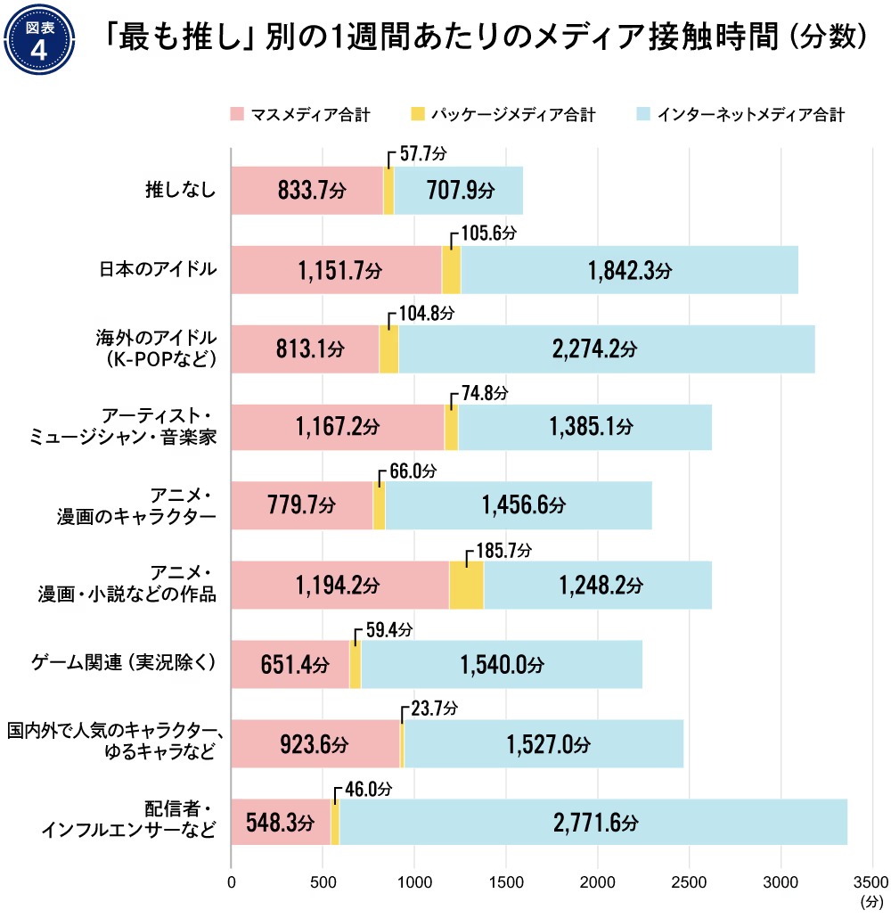 Meanwhile, for total internet media, "streamers/influencers" and "overseas idols (K-POP, etc.)" saw increased time. This likely stems from the prevalence of live streaming, longer content durations, and the wide variety of video content available. For total packaged media, as widely expected, "anime, manga, novels, and other works" had the highest contact time.
