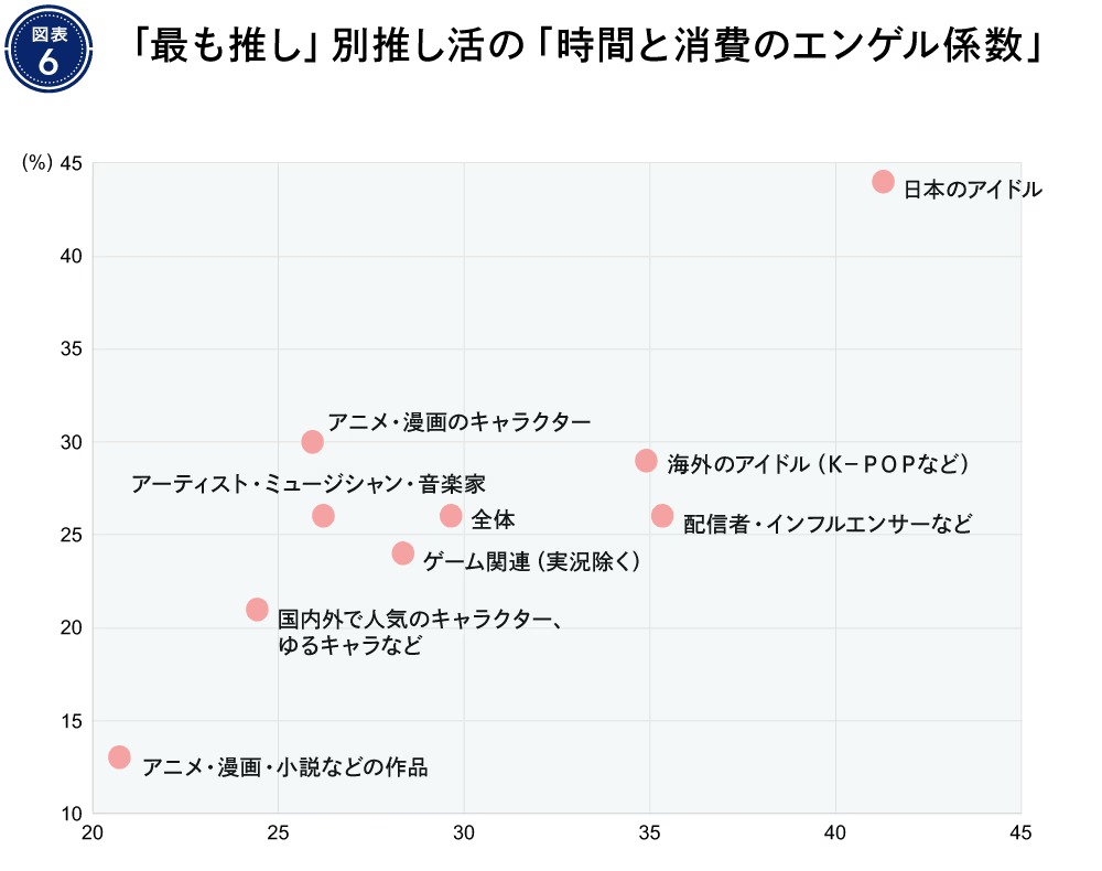 The X (horizontal) axis represents time, and the Y (vertical) axis represents money. As is immediately apparent, "Japanese idols" overwhelmingly dominate, with the highest investment ratio for both time and money. Analyzing this result, the following factors are thought to contribute to the exceptionally high time ratio: