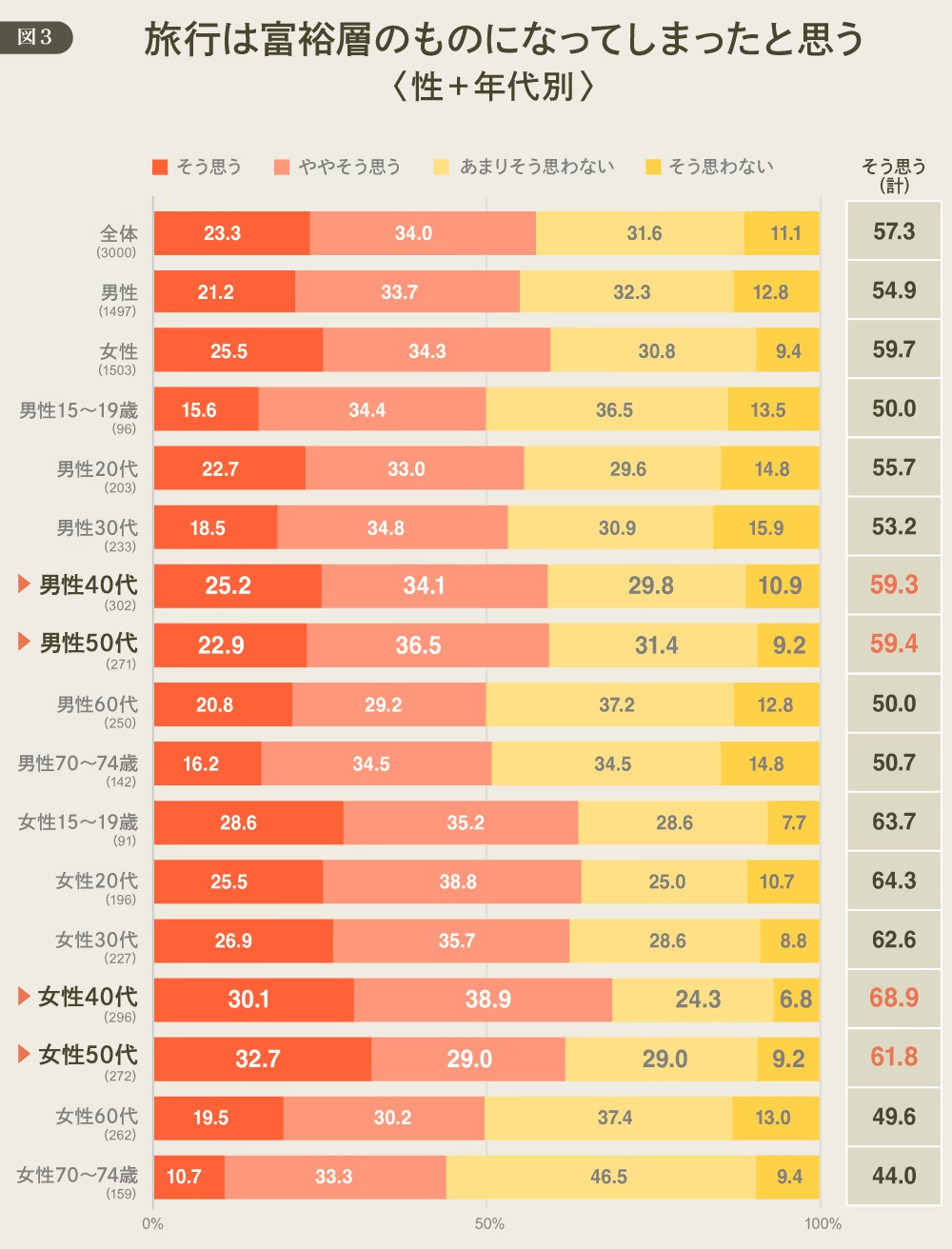 Regarding the statement "I think travel has become something only for the wealthy," 54.9% of all men and 59.7% of all women answered "I agree." Looking at it by age group, the tendency is particularly high among those in their 40s and 50s for both men and women (Figure 3). In other words, this suggests that the family generation feels a significant financial burden regarding travel.