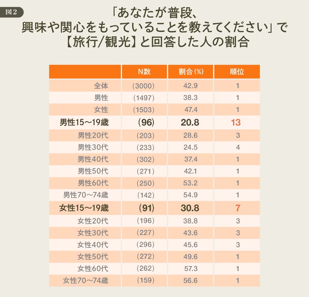 Furthermore, looking at responses to the question "Please tell us what you are usually interested in or care about," "Travel/Sightseeing" ranked 1st out of 46 items. Again, while slightly lower among teens of both genders, it consistently ranked within the top 3 for all other age groups (Chart 2).