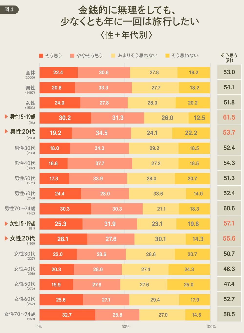 On the other hand, 54.1% of all men and 51.8% of all women answered "agree" to the question "I want to travel at least once a year, even if it means stretching my budget." This sentiment is stronger among younger respondents in their teens and twenties. Considering this alongside the previous results, while younger generations show less overall interest in travel compared to other activities, their desire to actually go on trips appears stronger than in other age groups (Figure 4).