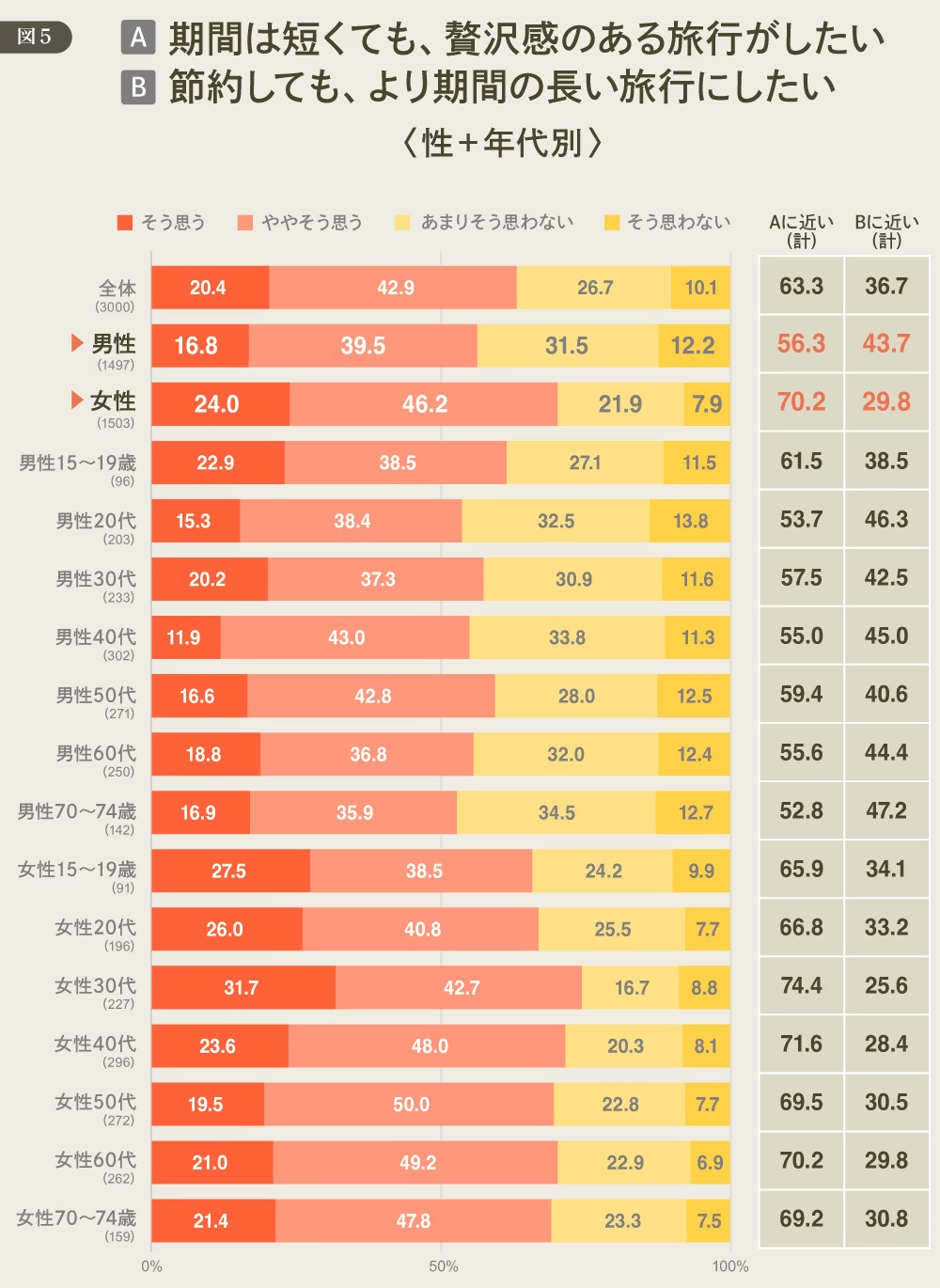 When asked whether they lean more toward "A: I want a luxurious trip, even if it's short" or "B: I want a longer trip, even if it means saving money," the overall trend favored "A: I want a luxurious trip, even if it's short." However, men showed a slightly higher tendency toward "B: I want a longer trip, even if it means saving money" (Figure 5).