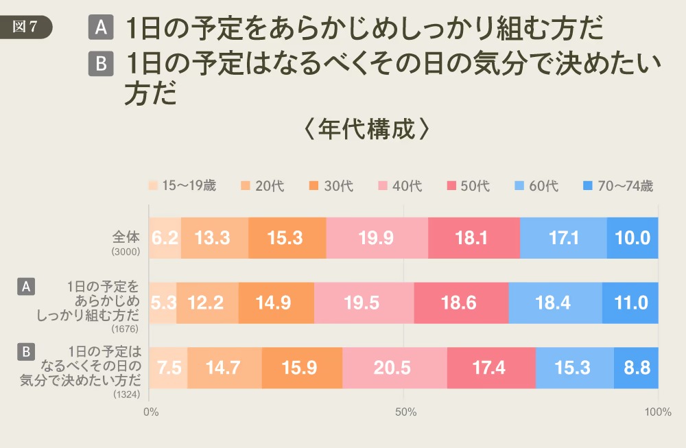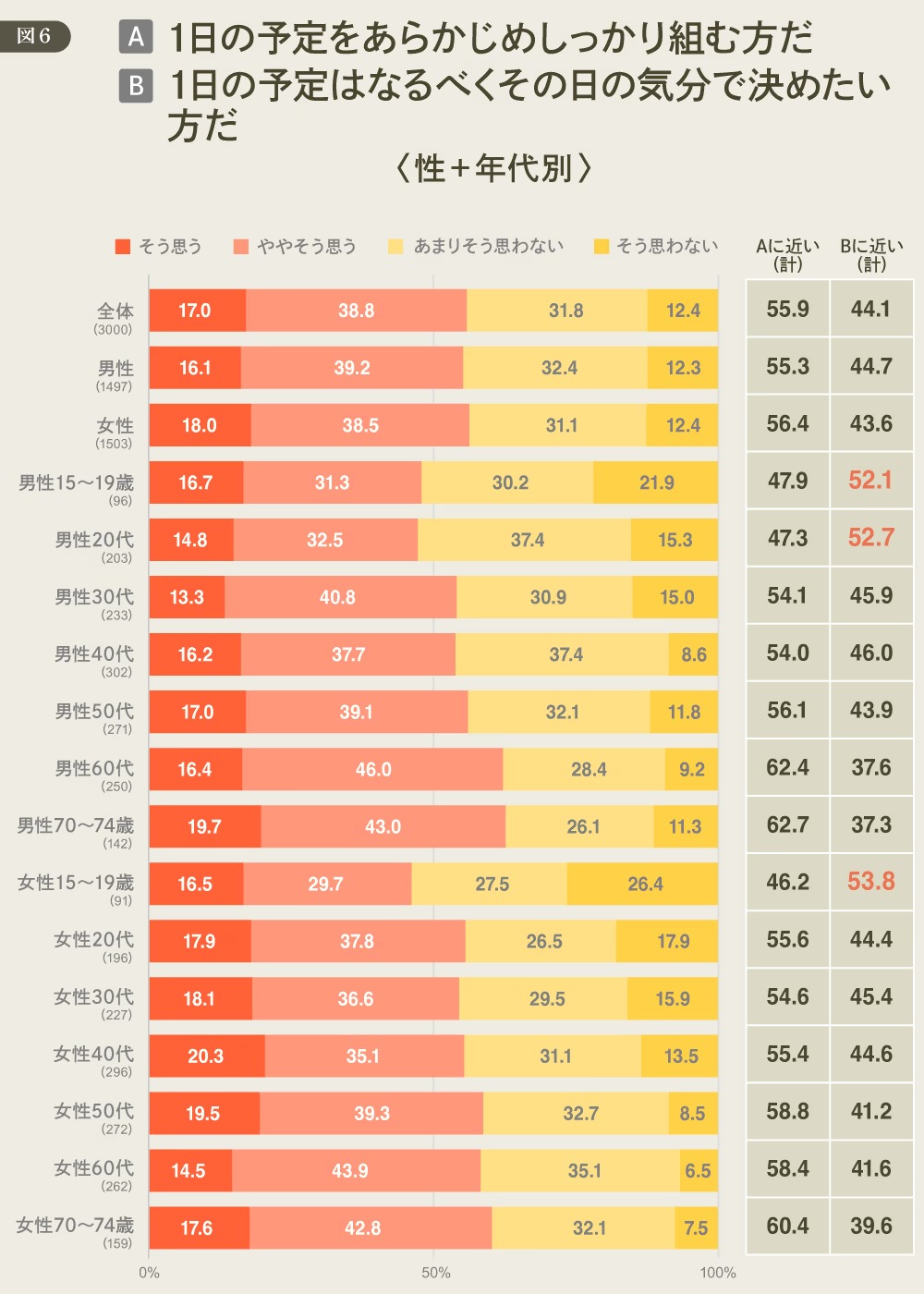 Looking at the items "[A] I tend to plan my day's schedule thoroughly in advance" (hereafter referred to as the "schedule-adherent group") and "[B] I prefer to decide my day's schedule based on my mood that day" (hereafter referred to as the "impulsive group"), overall, the [A] schedule-adherent group tends to be slightly larger (Figure 6).