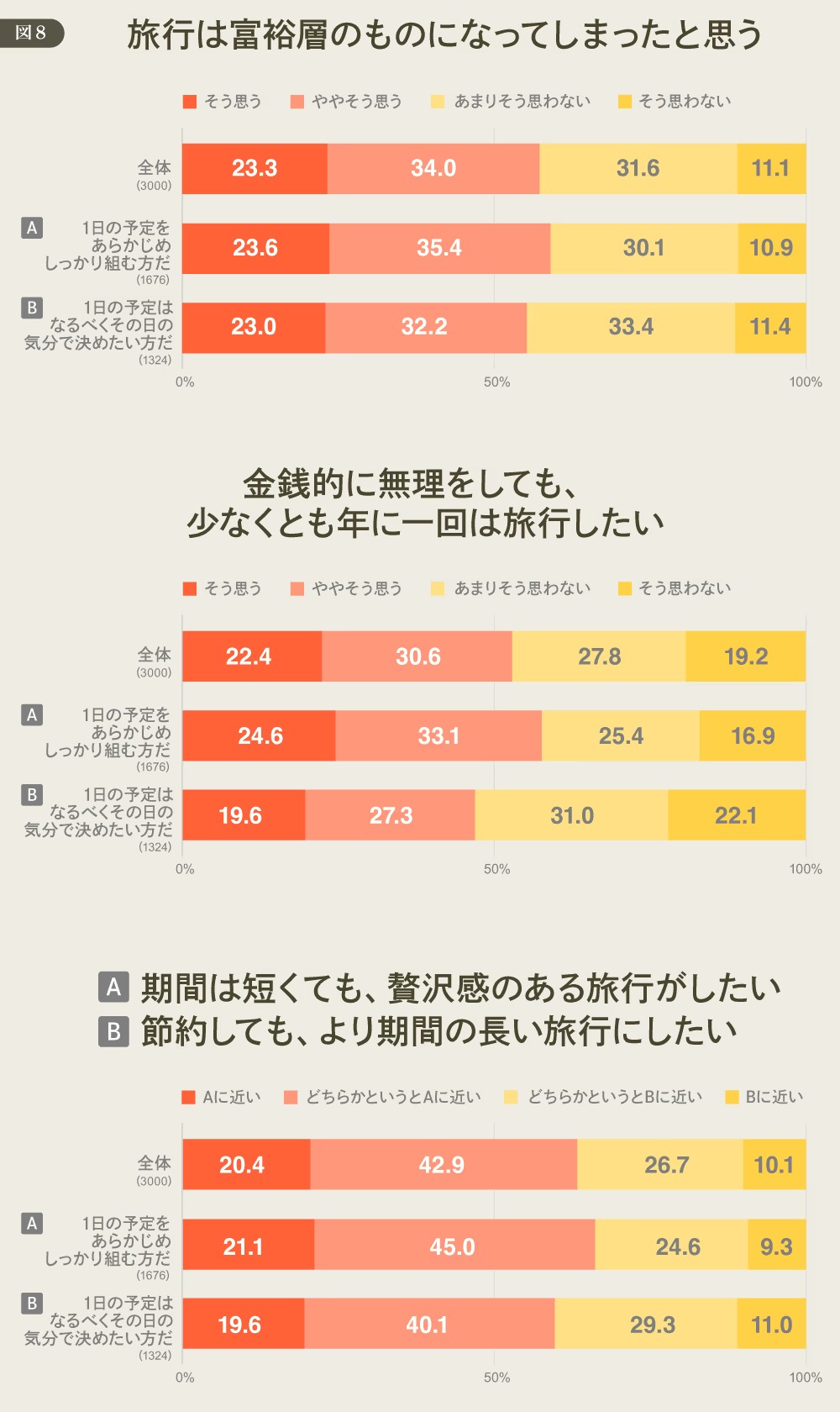 Regarding travel preferences, 66.1% of the [A] Scheduled Travelers group answered "I want a luxurious trip, even if it's short," while only 59.7% of the [B] Impulsive Travelers group agreed. Conversely, 40.3% of the [B] group answered "I want a longer trip, even if it means saving money" (Figure 8).