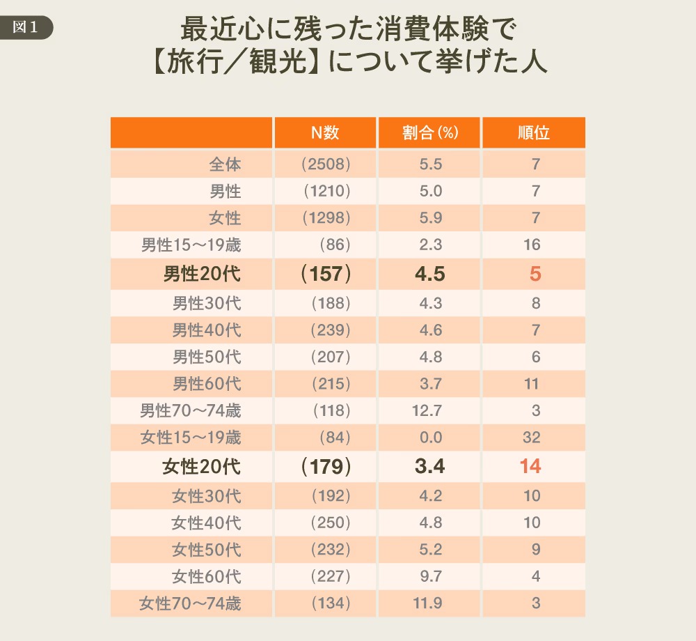 Among teens, it was almost nonexistent for both genders. For men in their 20s, it ranked 5th, while for women in the same age group, it ranked 14th. For all subsequent age groups, it consistently ranked around 10th place. Among various consumption experiences, "travel/sightseeing" can be said to rank relatively high (Figure 1).