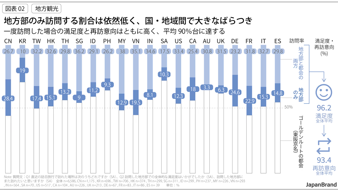 Among visitors who traveled to regional areas, satisfaction with regional tourism stood at 96.2%, and 93.4% expressed a desire to return. This clearly demonstrates high satisfaction and strong revisit intent for regional tourism. This trend was consistent across all surveyed countries and regions. These figures suggest that encouraging travel to regional areas is a win-win initiative: it not only promotes sustainable tourism in Japan but also leads to a highly satisfying Japan experience from the visitor's perspective.