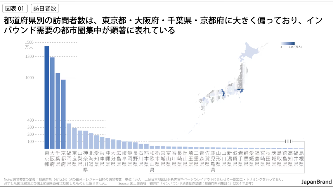 However, a closer look at the breakdown reveals a significant regional imbalance in visitor destinations. Data released by the Japan Tourism Agency shows the number of international visitors by prefecture for 2024. Tokyo ranked first with 14.46 million visitors, followed by Osaka Prefecture with 12.88 million, and Chiba Prefecture with 10.64 million, showing a clear concentration in metropolitan areas. In contrast, the bottom rankings were Shimane Prefecture with 43,000 visitors, Fukui Prefecture with 52,000, and Kochi Prefecture with 71,000.