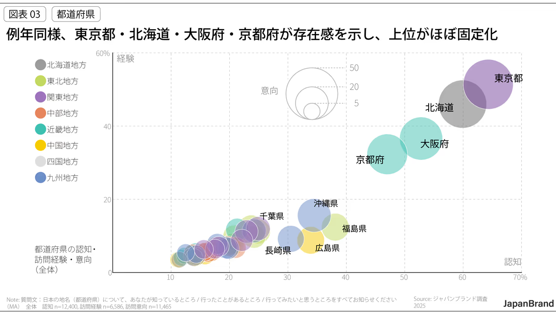 On the other hand, a clear challenge remains: among overseas residents, awareness of and visit intentions for regional areas are significantly lower compared to urban centers. By prefecture, Tokyo overwhelmingly leads in awareness, experience, and visit intentions, followed by Hokkaido, Osaka Prefecture, and Kyoto Prefecture, which also stand out significantly above other prefectures.
