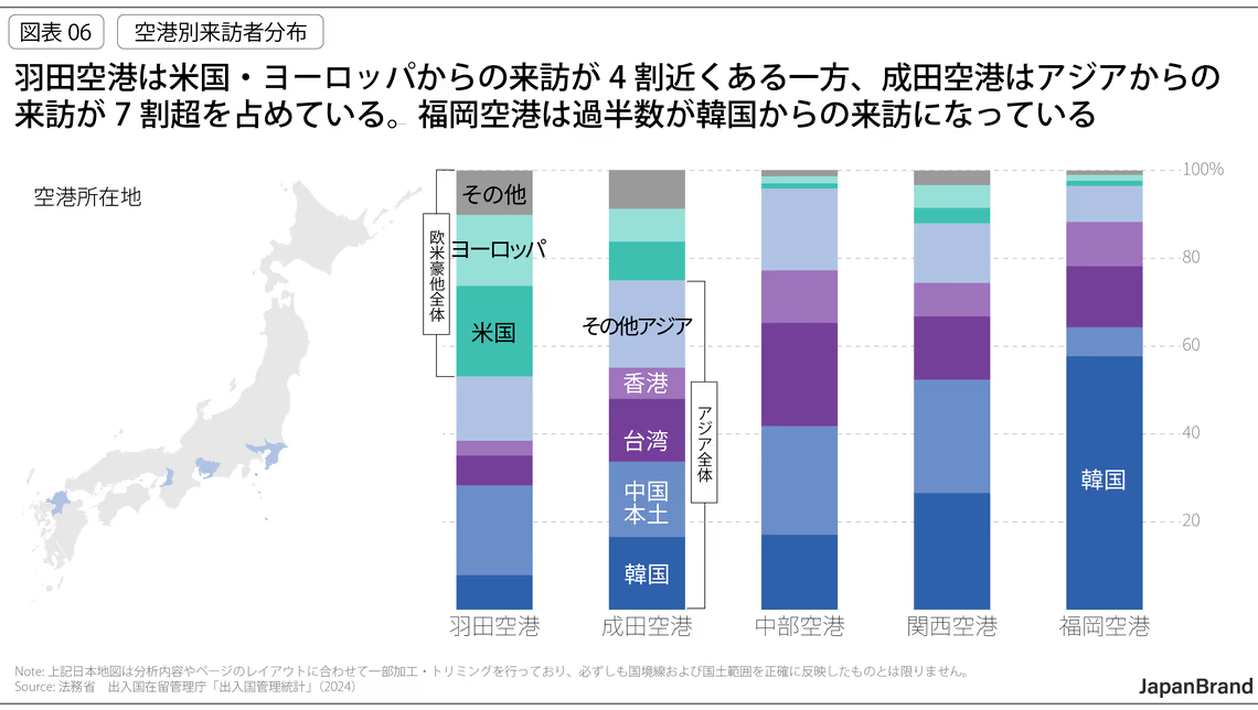 For instance, nearly 40% of visitors to Haneda Airport come from the US and Europe, while 70% of visitors to Narita Airport come from Asia. Furthermore, over half of visitors to Fukuoka Airport come from South Korea, clearly showing distinct regional trends.