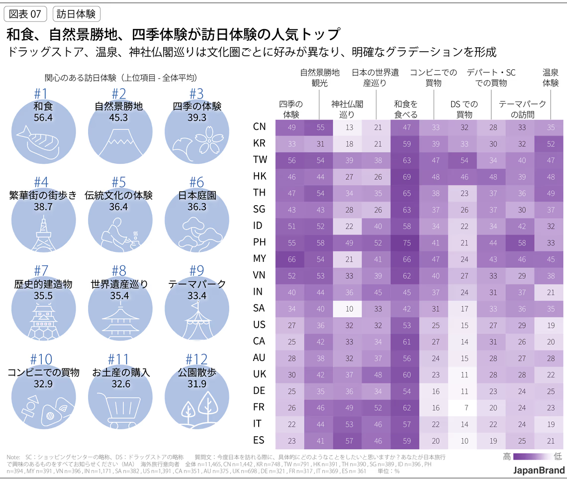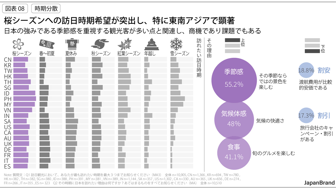 The table above also reveals characteristics by country/region. Interest in Japanese cuisine is high overall, including in Europe, America, and Australia, while experiencing the four seasons is particularly popular in Southeast Asia, where the climate differs significantly. Since Japanese cuisine and natural scenic spots are highly associated with "seasons" and "peak times," identifying the optimal "season" to attract visitors is crucial.