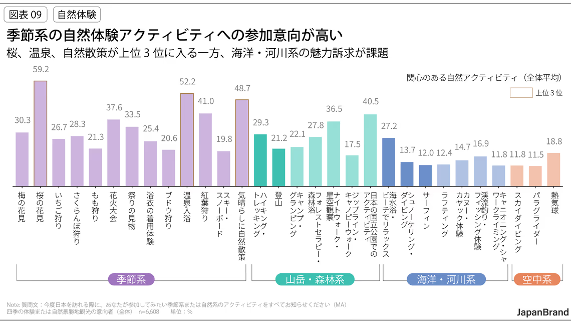 Figure 9 shows that following "cherry blossom viewing," activities like "hot spring bathing," "nature walks," "autumn foliage viewing," "fireworks festivals," "stargazing," and "fruit picking" are popular. There remains room to capture more attention for activities in mountainous, marine, and river environments.