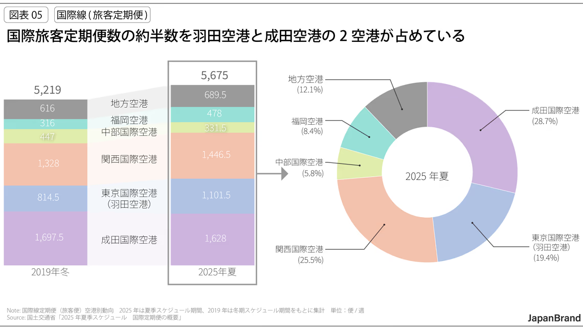 While Japan has 97 airports, looking at the number of international scheduled passenger flights for summer 2025 (as announced by the Ministry of Land, Infrastructure, Transport and Tourism) by airport shows: Narita International Airport and Tokyo International Airport (Haneda) account for approximately 50%. Kansai International Airport accounts for 25.5%. Chubu Centrair International Airport accounts for 5.8%. Fukuoka Airport accounts for 8.4%. Other regional airports account for 12.1%.