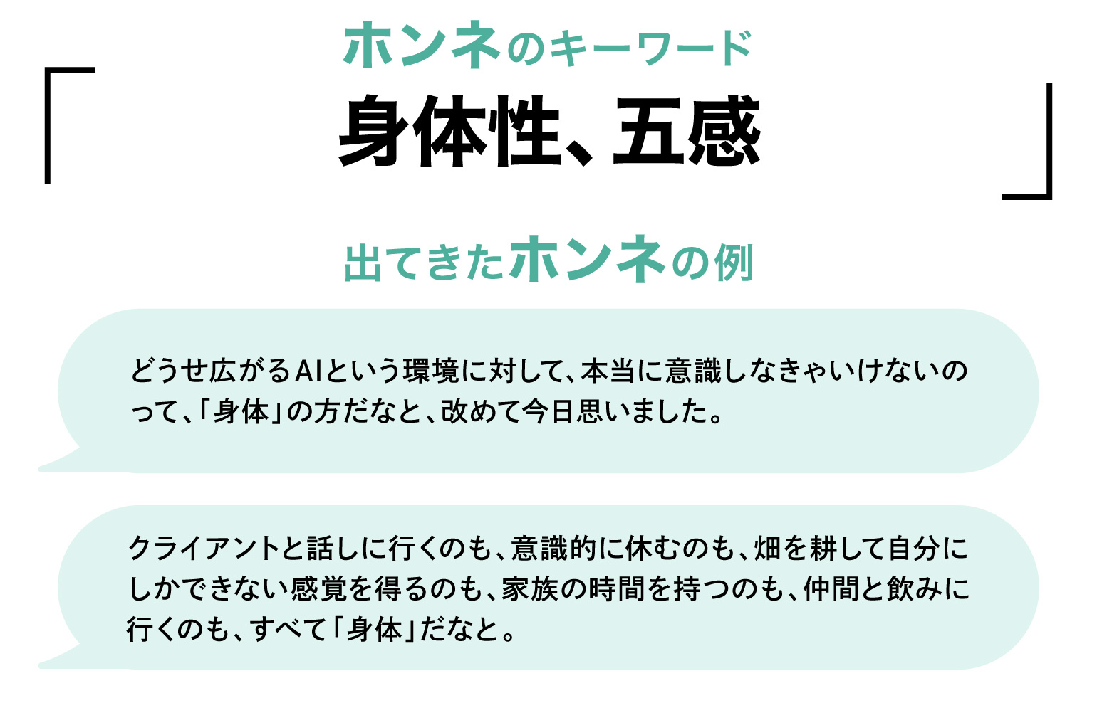 <Examples of Naturally Emerged "Honest Keywords"> How to deal with the emerging AI gap / "AI can do it in an instant, right?" / Where does ownership lie? / Being honest with emotions / Are we working with training data? / Living healthily with AI / Curiosity / The vitality of work / Work is about eating and being eaten / Physicality, the five senses / Productivity increases. So does labor intensity / Why are we creating this? / Resetting positions and titles