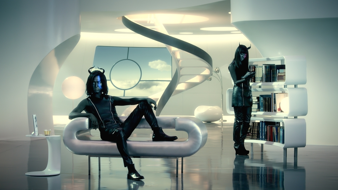 The setting is the room of the Stylish Alien . His girlfriend, a female Stylish Alien (Kuriyama), visits and discovers sexy DVDs on his bookshelf. She reads the titles aloud to him: "Race Queen Stylish Alien," "Jiggly Stylish Alien," "Nurse Stylish Alien," and so on. The Oshare Alien maintains a cool expression while breaking out in a cold sweat. As the narration plays over a cut of someone enjoying the product, "If you sweat, try GATSBY Ice Body Paper."